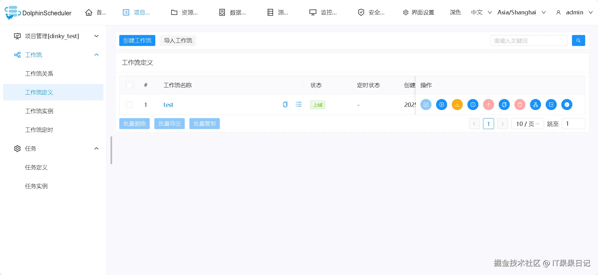 进入 DolphinScheduler ,项目列表会出现一个新的项目,项目名称和在 dinky 中配置的一样,我的是叫做 dinky_test 。进入dinky_test项目可以看到一个叫做 test 的工作流定义, test 名称对应的是 dinky 项目的目录名称。