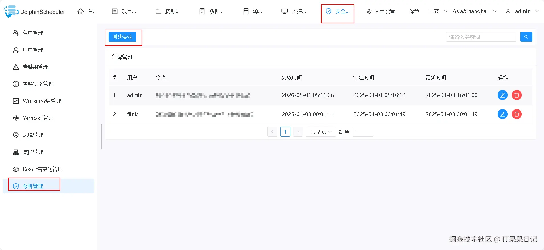 登录到 dolphinscheduler ,进入顶部菜单 安全中心 ,点击左侧菜单 令牌管理