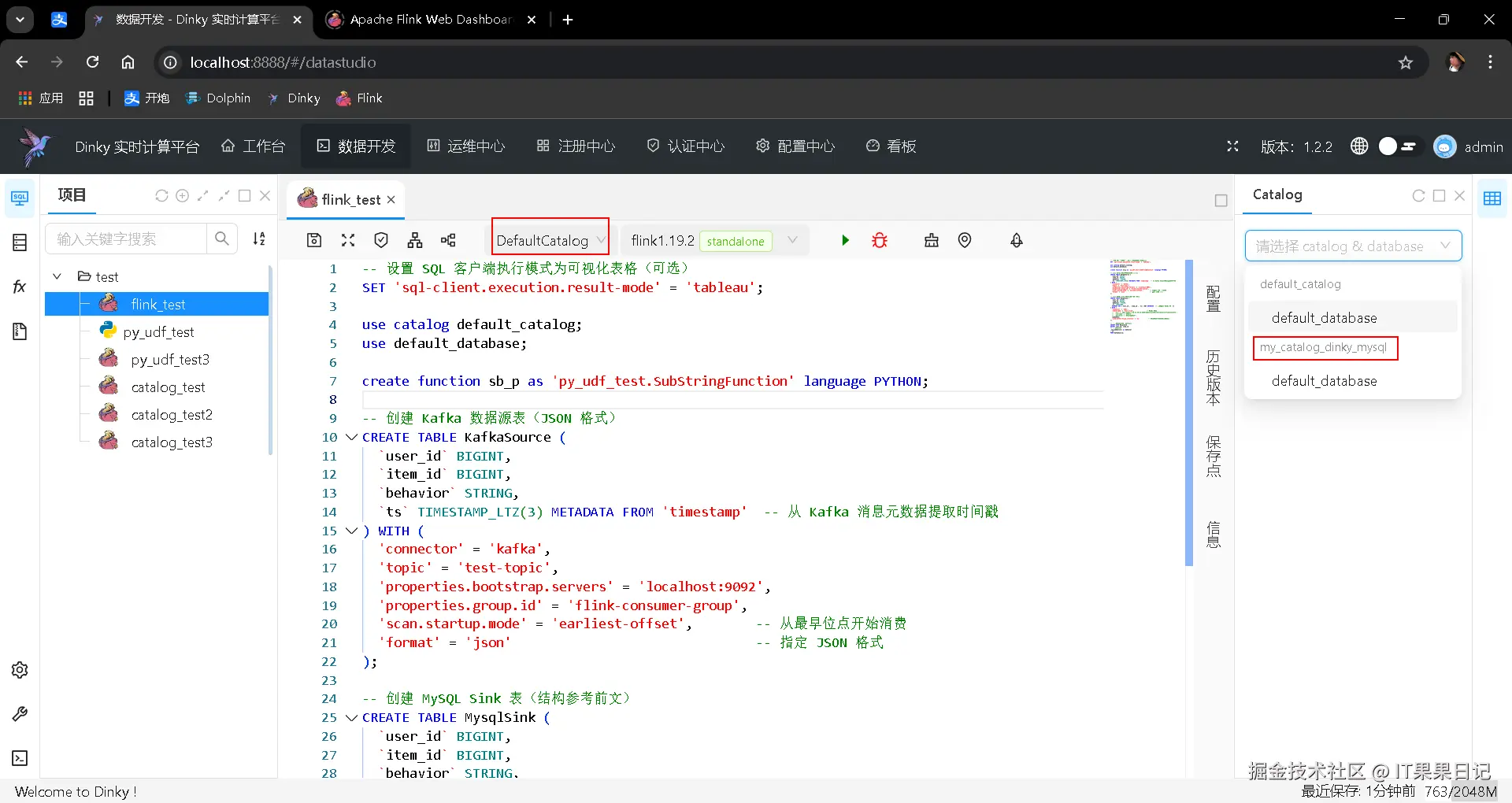 上图中看以看到Catalog里已经保存了KafkaSource表、MysqlSink表和udf函数sb_p 。