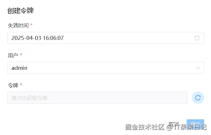 点击创建令牌按钮,在弹出框中选择用户,注意失效时间一定重新选择,否则一会就失效了。