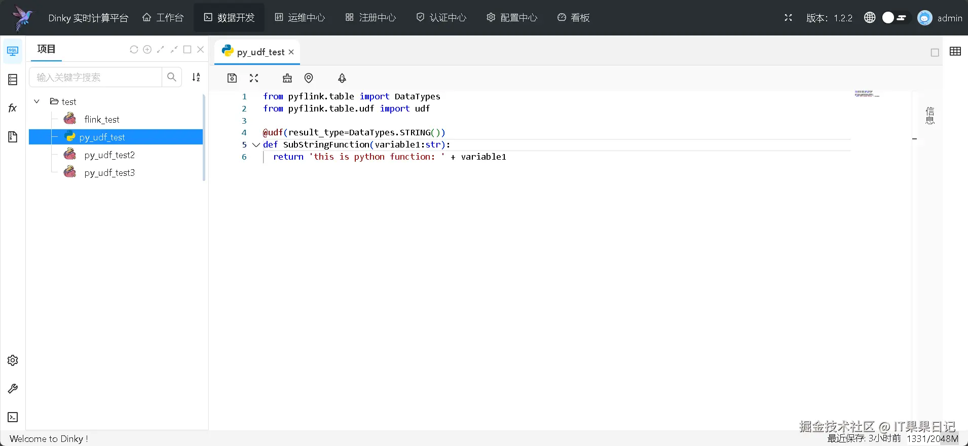 如图所示,创建了一个别名为 sb_p 的函数,该函数引用的是 py_udf_test 这个 udf 的 SubStringFunction 函数。注意, py_udf_test 必须和 flink_test 作业在一个目录下面,不然会引用不到。