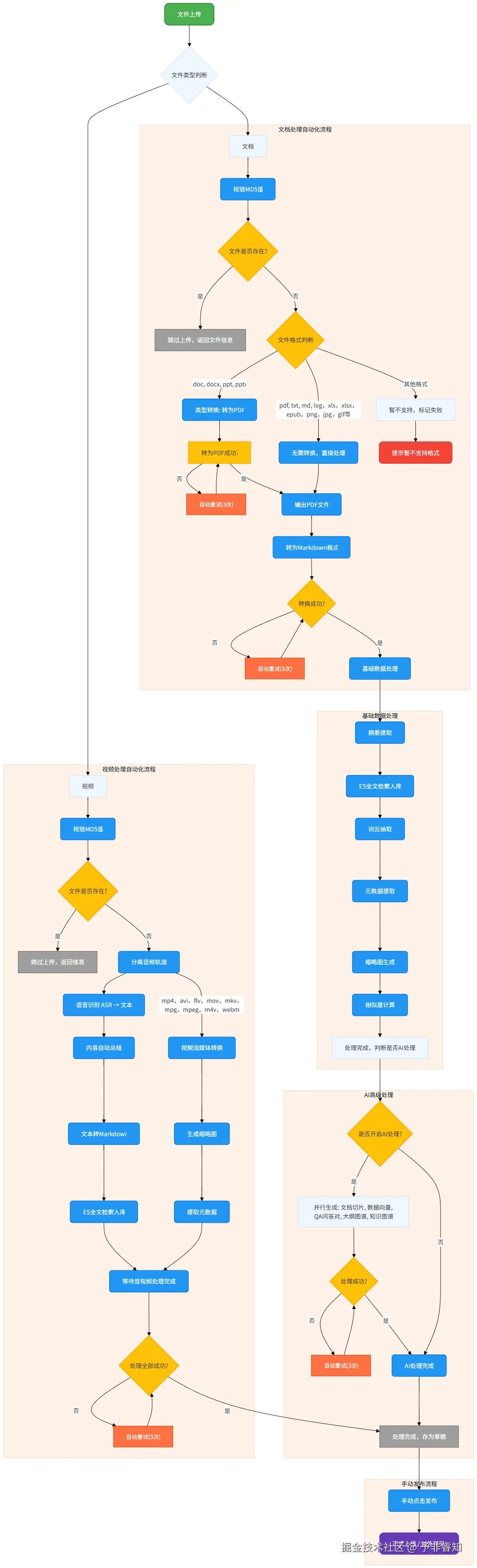 整个流程从“文件上传”开始,通过智能的“文件类型判断”,自动分流至最优的处理管线,主要分为“文档处理”和“视频处理”两大核心模块。