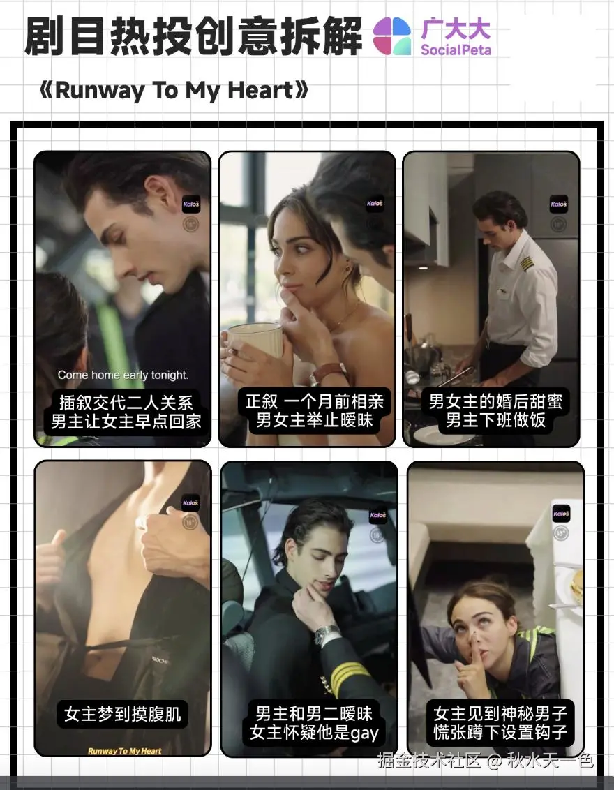 根据广大大捕捉到的该剧本月最热素材来看,投放时间为1周,展示估值超过20万+,视频素材时长11min28s。剧情开篇,采用插叙手法直接交代二人不一般的关系;中间部分,正叙交代二人相亲闪婚过程,先是一段暧昧同居氛围,其中通过对话和闪回埋下伏笔,男主早在学生时代就喜欢女主。男主与男二举止亲密让女主产生怀疑,怀疑男主性向;结尾部分,用女主看到一个神秘男子大惊失色的神态作为钩子,制造悬念。