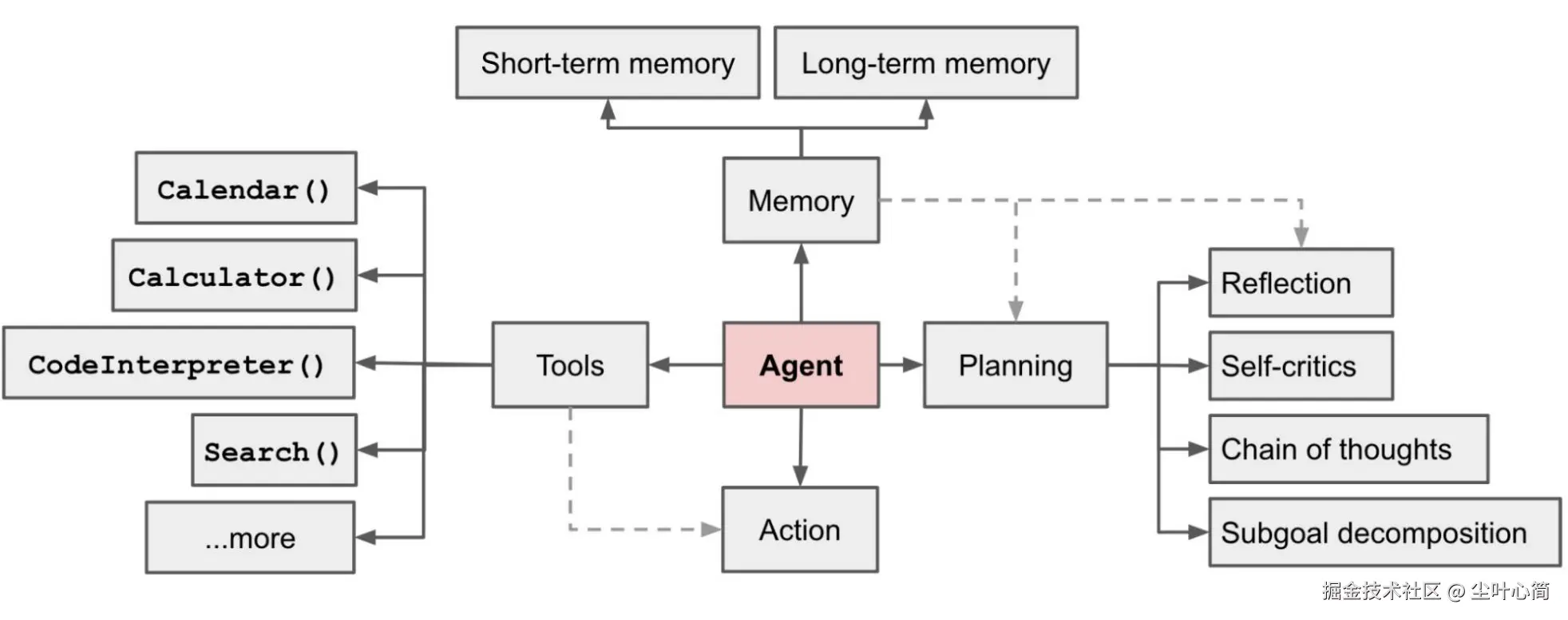 具有复杂推理能力、记忆和执行任务手段的自主代理; Agent = 规划 + 记忆 + 工具 + 行动