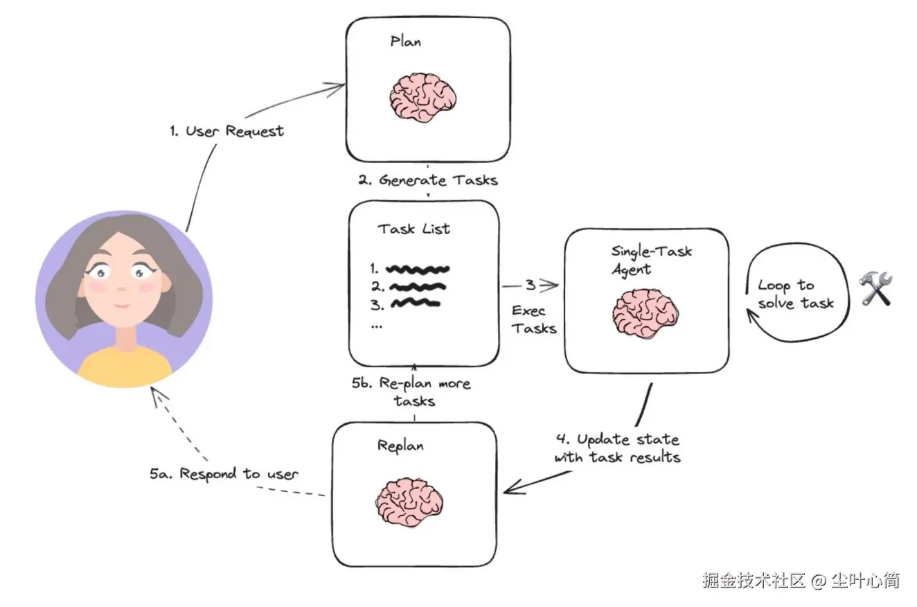 一般过程为:你提需求 → 小助手分解任务(任务分解) → 一个个执行 → 整理结果 → 给你答案。 在一个个执行中又回有如下执行步骤: ReAct → 边想边做 Reflexion → 做完总结经验 Chain of Thought → 按步骤推理 Graph of Thought → 多路径思考、对比选择