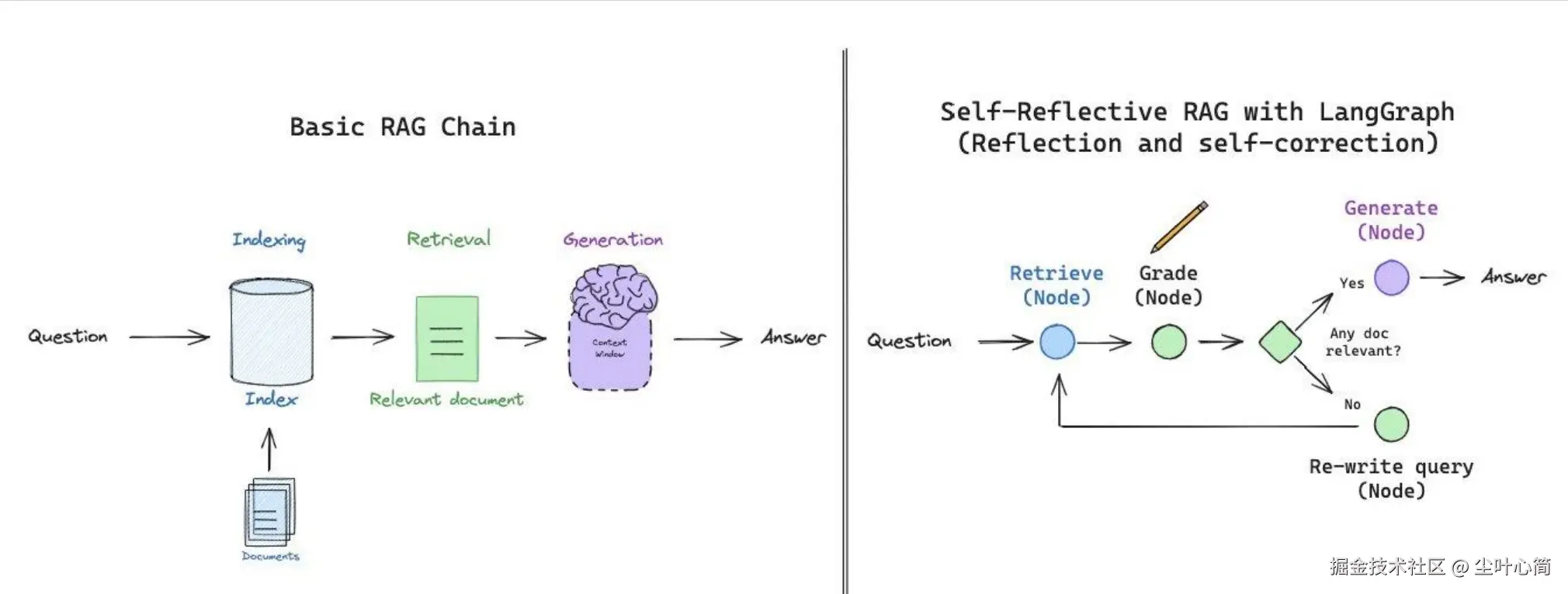 传统RAG流程(左图):从向量数据库检索文档相关内容后直接回答问题。 RAGAgent流程(右图):从向量数据库检索文档后,进一步检查文档内容跟问题是否匹配,如果匹配则回答问题,如果不匹配,则改写问题重新检索,循环往复。