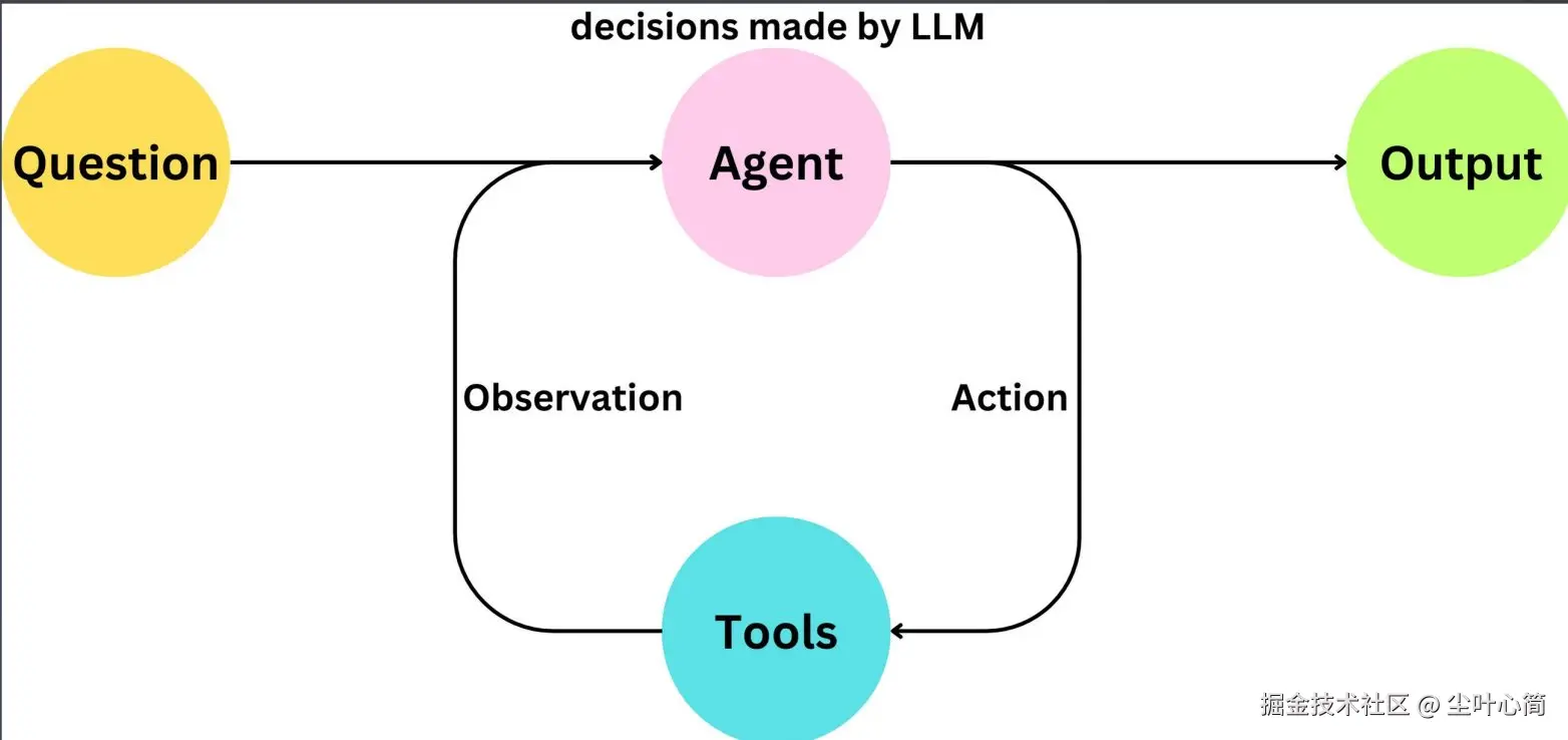 流程大概是这样: 你提问题(Question) 比如你问:“帮我写一段 Python 代码画个柱状图。” Agent(智能助手)思考 它会决定自己能不能直接回答,还是要借助工具。 调用工具(Tools) 工具可以有很多种: 搜索:去网上找信息。 RAG(检索增强生成):从知识库里找资料。 代码解释器:运行一段代码,拿到结果。 数学计算:算一道复杂公式。 其他 API 服务:比如查天气、发邮件、调用数据库等等。 这一步就是 Agent 发出行动(Action)→ 工具执行 → 返回观察结果(Observation)。 得到结果(Output) 工具执行完,Agent 整理结果,最终给你答案。