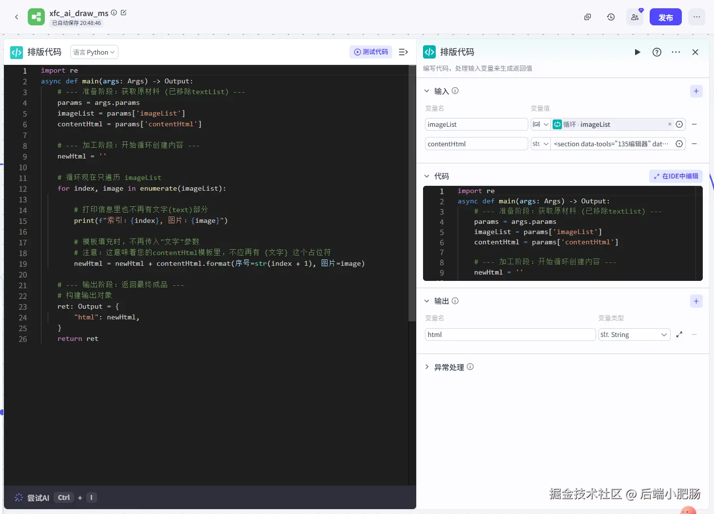 代码排版: 这个节点的作用是将图片排版为html格式,这里需要定义一个模板,网上很多模板,自己找就行,你不用代码也可以自己用其他方法把图片列表转换为html格式,不一定非要抄我的。
