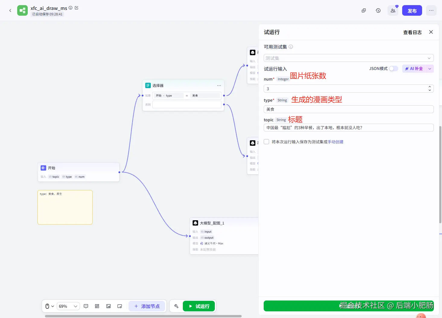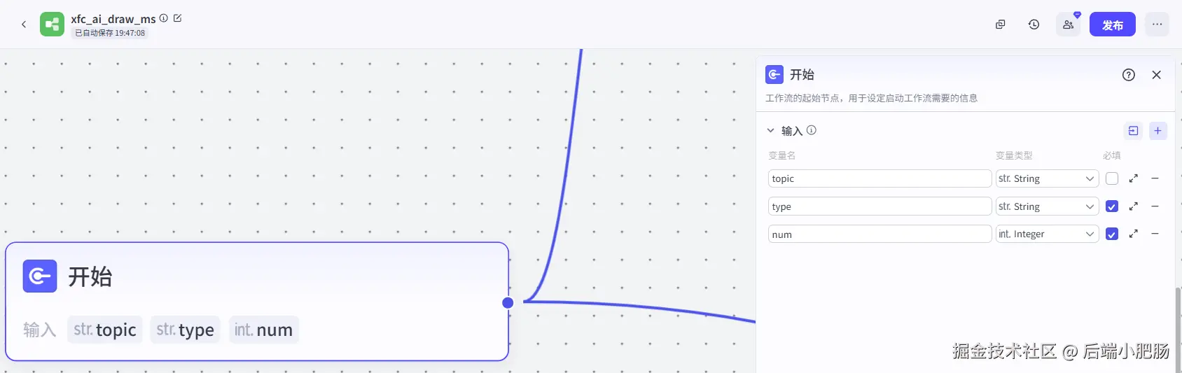 开始节点: 开始节点包含三个参数,topic文章标题,type为生成的图文类型(输入参数可以为美食或ys),num为生成的图片数量。