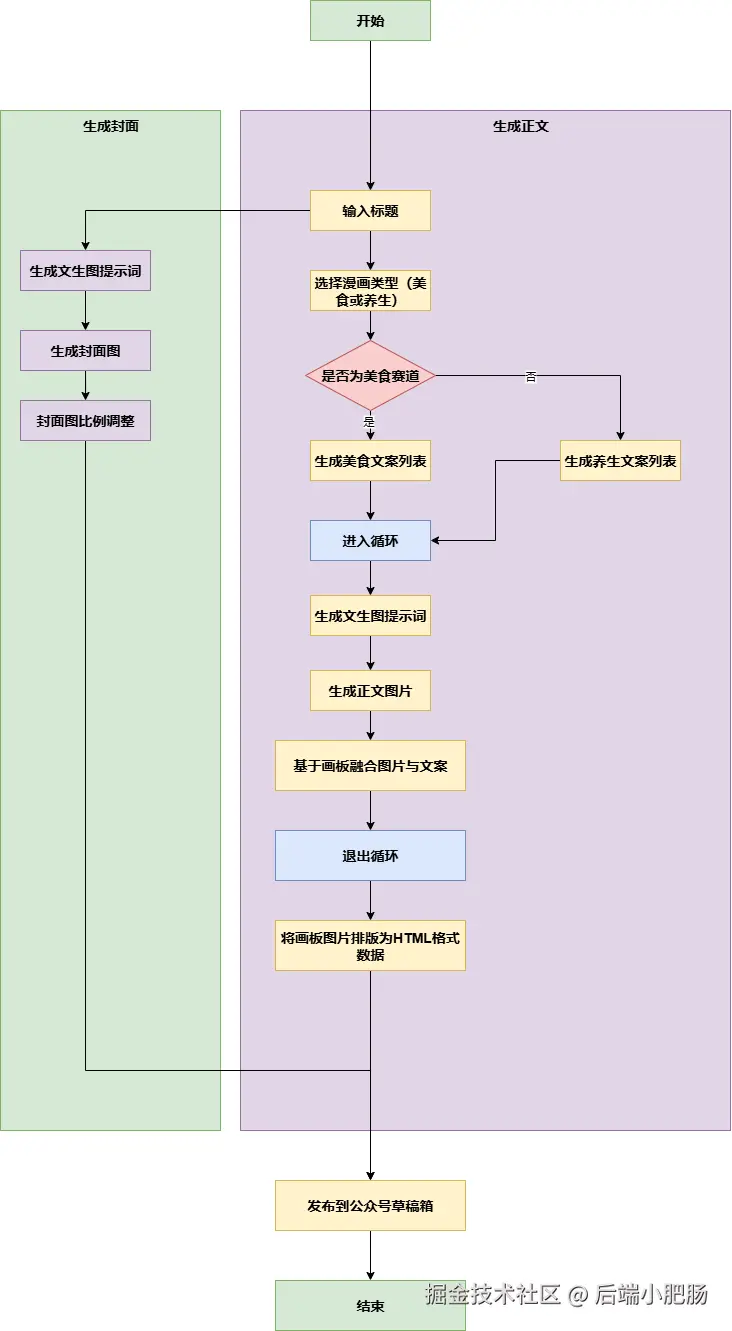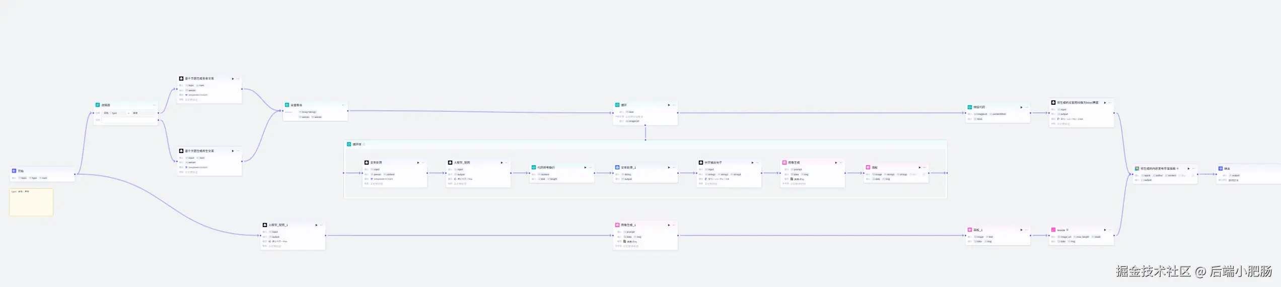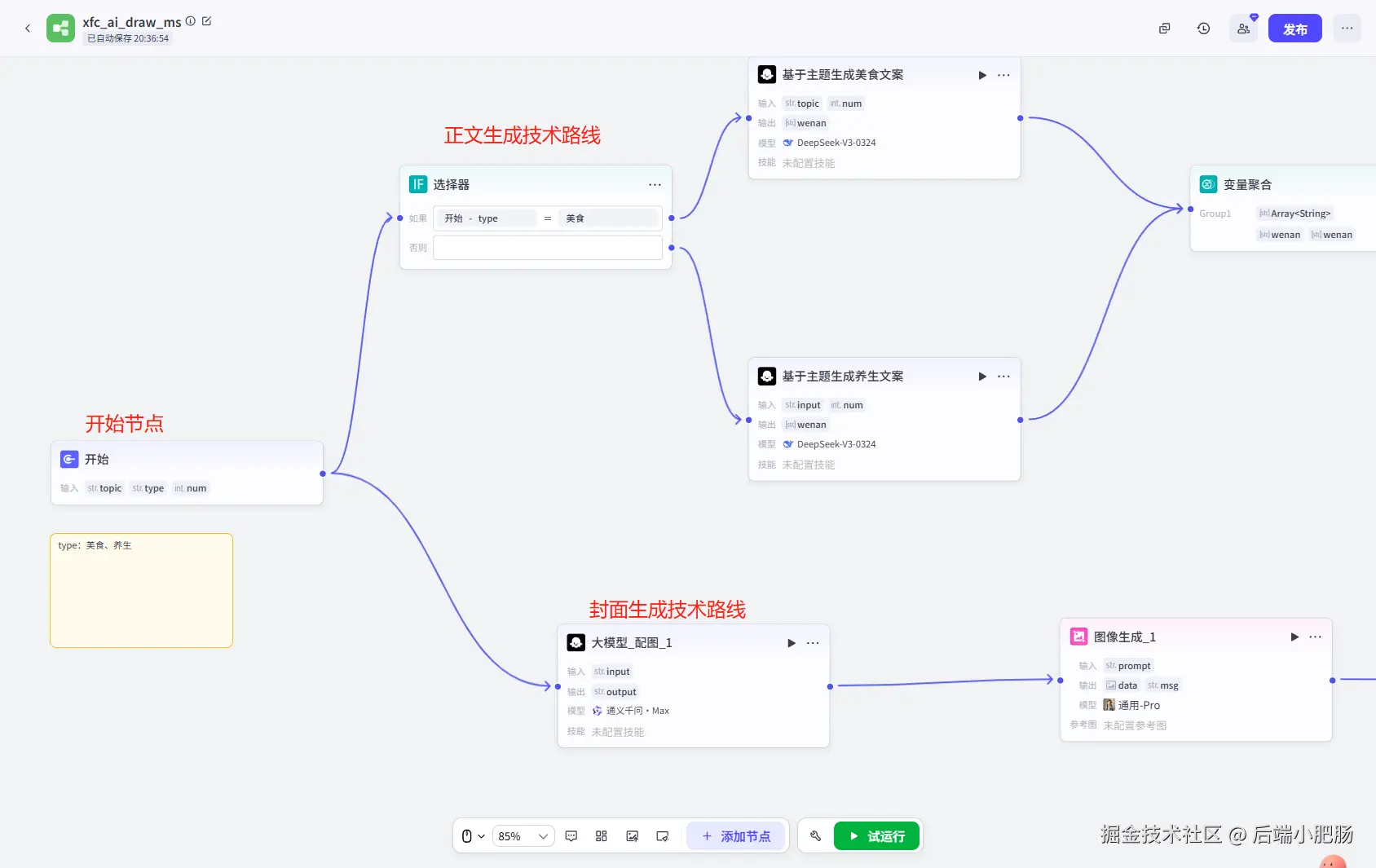 开始节点出来以后就分成了封面生成和正文生成路线,如下图所示,接下来我会将封面和正文两条技术路线分开来讲。