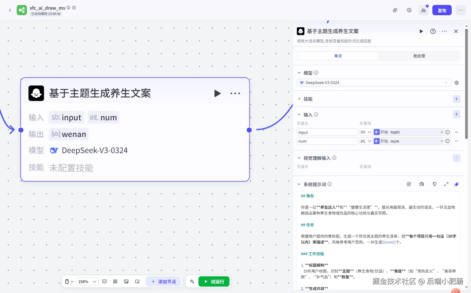 基于主题生成美食文案( 大模型 ): 这个节点的作用是基于开始节点的标题和num生成文案列表。