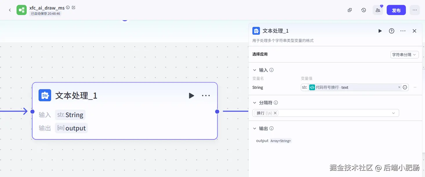 循环内-文本处理: 在循环中第一个节点首先来到了文本处理,在这个节点我们需要将食物和文案进行分隔,食物输出到food参数中,文案输出到content参数中。