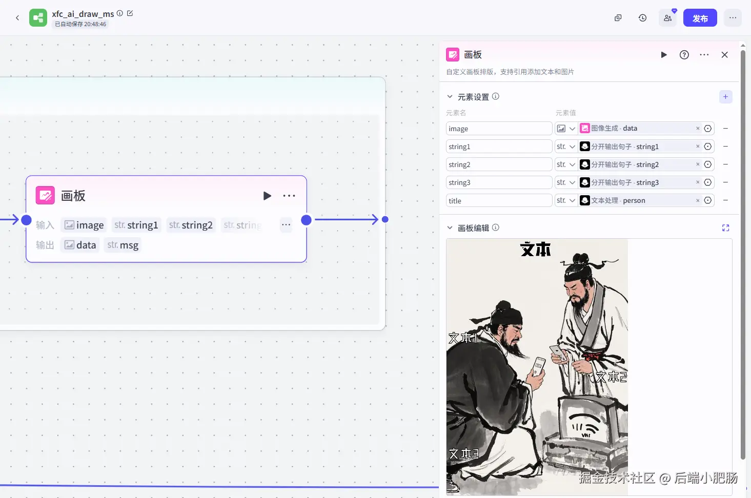 循环内-画板: 画板的作用就是将图片与文案进行组合,可以看到输入的参数为图像,被打散的文案(string1、string2、string3),食物名称,我们只需要将图片和文案按照位置进行摆放,绑定变量,就能得到成品漫画图片。