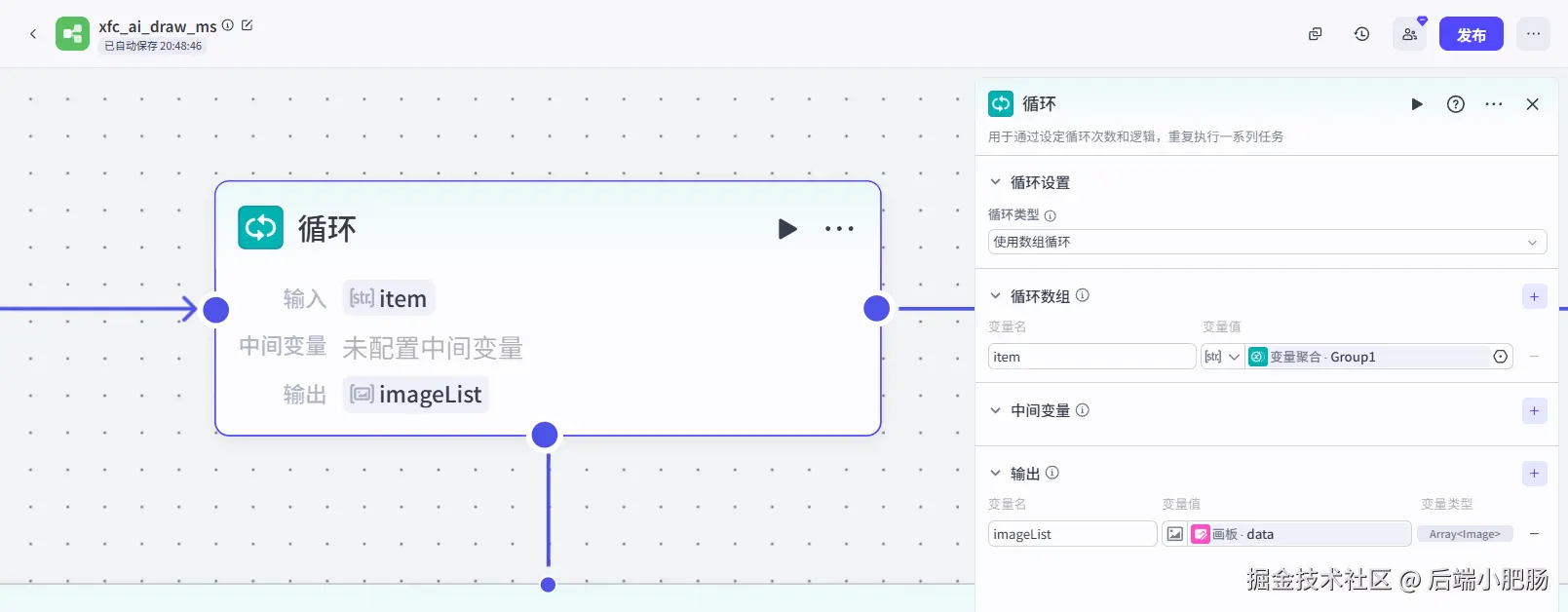 循环(开始和结束): 在循环中我们需要对文案列表(美食或ys食物)中的每个文案进行配图和成品漫画图片配置处理,在循环结束时需要获取成品的漫画图片列表。
