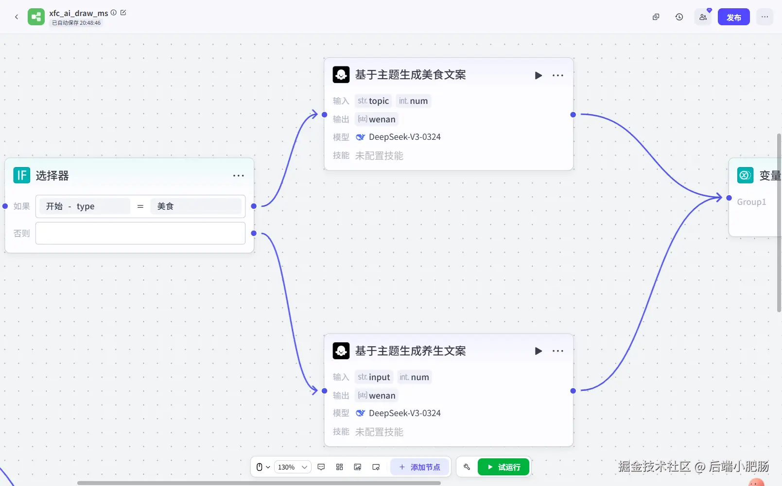 选择器: 在生成正文分支,第一个节点为选择器节点,在这个节点中需要对开始节点的type进行判断,如果为美食就进入生成美食文案的节点,如果为ys就进入生成ys文案的节点。