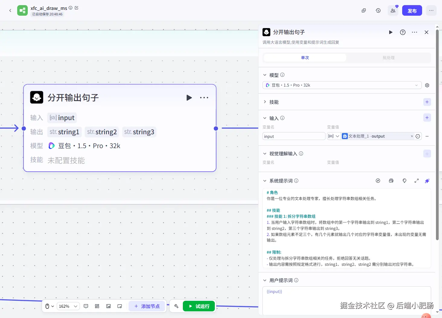 循环内-分开输出句子: 这个节点为大模型节点,核心的作用就是将输出的文案列表进行标识,将文案列表中的第一个元素标识为string1,第二个元素标识为string2,第三个元素标识为string3。