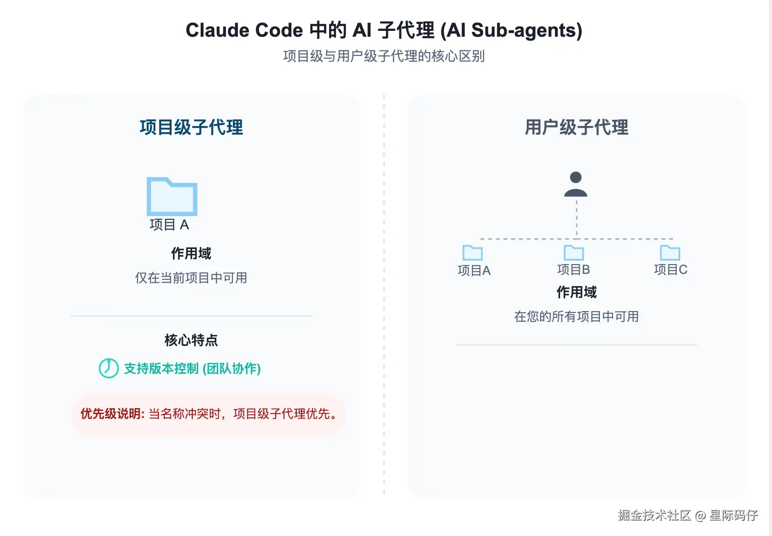 - 如果是团队协作,建议选择“项目级”。这样可以将子代理的配置文件纳入版本控制(如 Git),方便团队成员共享、协作和迭代。