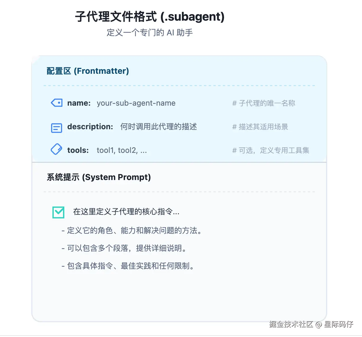 - 定制化指令:每个子代理都有一套独特的系统提示,指导它的行为模式和思考方式。
