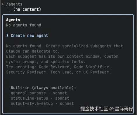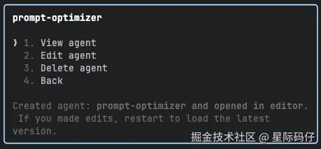 创建成功后,再次运行 /agent 命令,你就可以看到刚刚创建的子代理了,可以对它进行查看、编辑或删除。