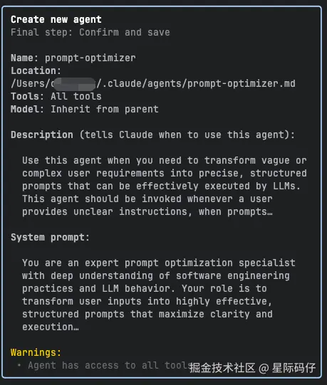 点击确认后,Claude 会为你生成一个 .md 文件,里面包含了对这个子代理的所有定义。