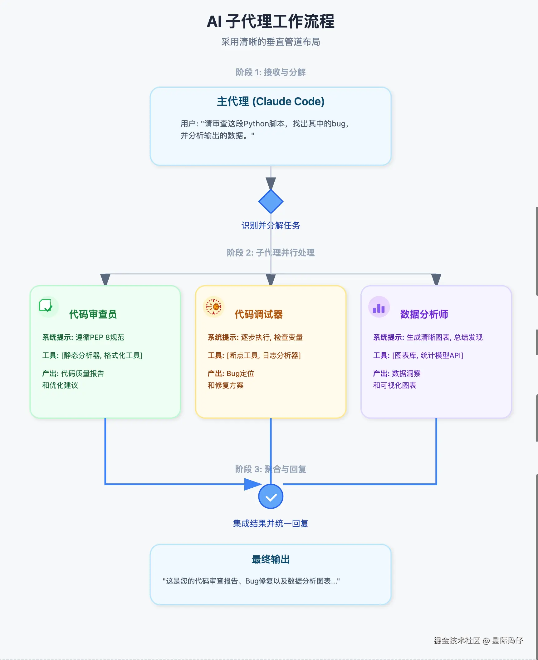 - 独立执行:每个子代理依据自己的“行为指南”,调用专属的“工具箱”,独立完成任务。