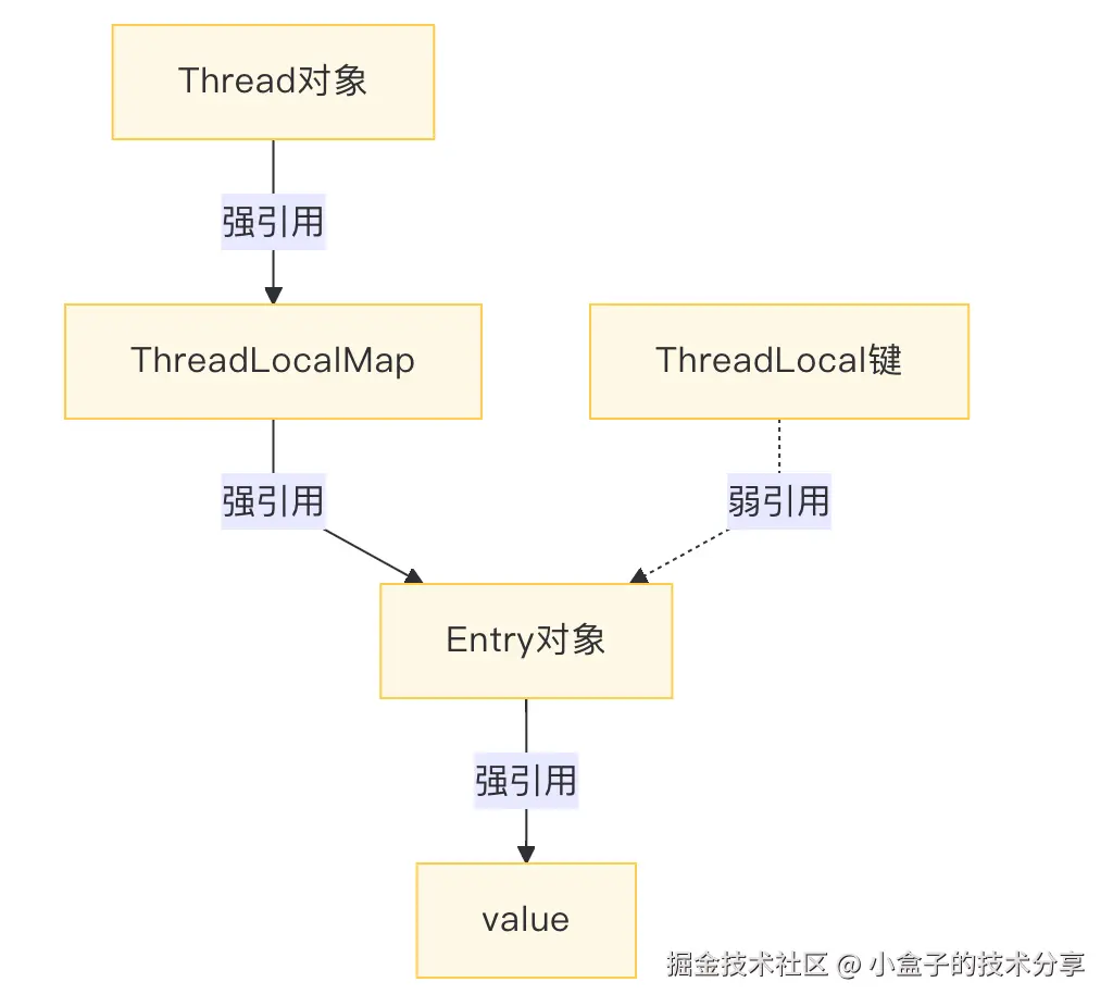 我们来捋一下:Threadlocal 键被弱引用包装,可能被 GC 回收变 null,但存的那个 value 被 entry 对象强引用。 然后这个 entry 对象又被 ThreadLocalMap 持有,ThreadLocalMap 又被那个 Thread 对象持有。
