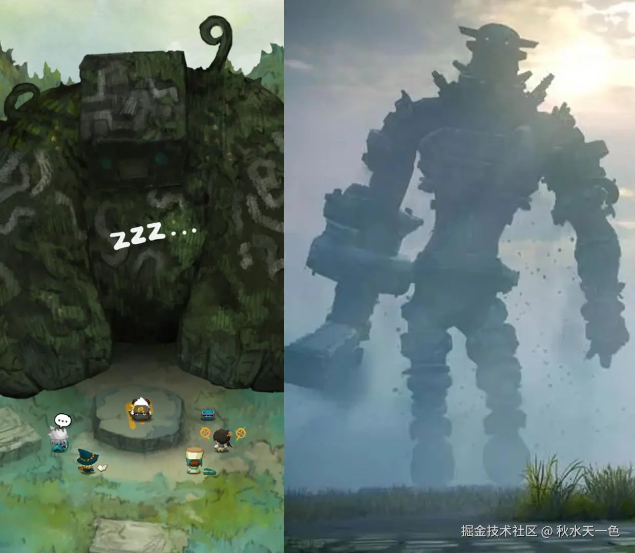 先看美术风格,【Pompo: Backpack Heroes】的画风接近水彩纸绘像素风,颜色饱和度不算高。由于剧情设定是类似中世纪的奇幻背景,游戏中少不了那些体型巨大却不算恐怖的怪物Boss们,让人很容易联想到索尼古早神作【旺达与巨像】。