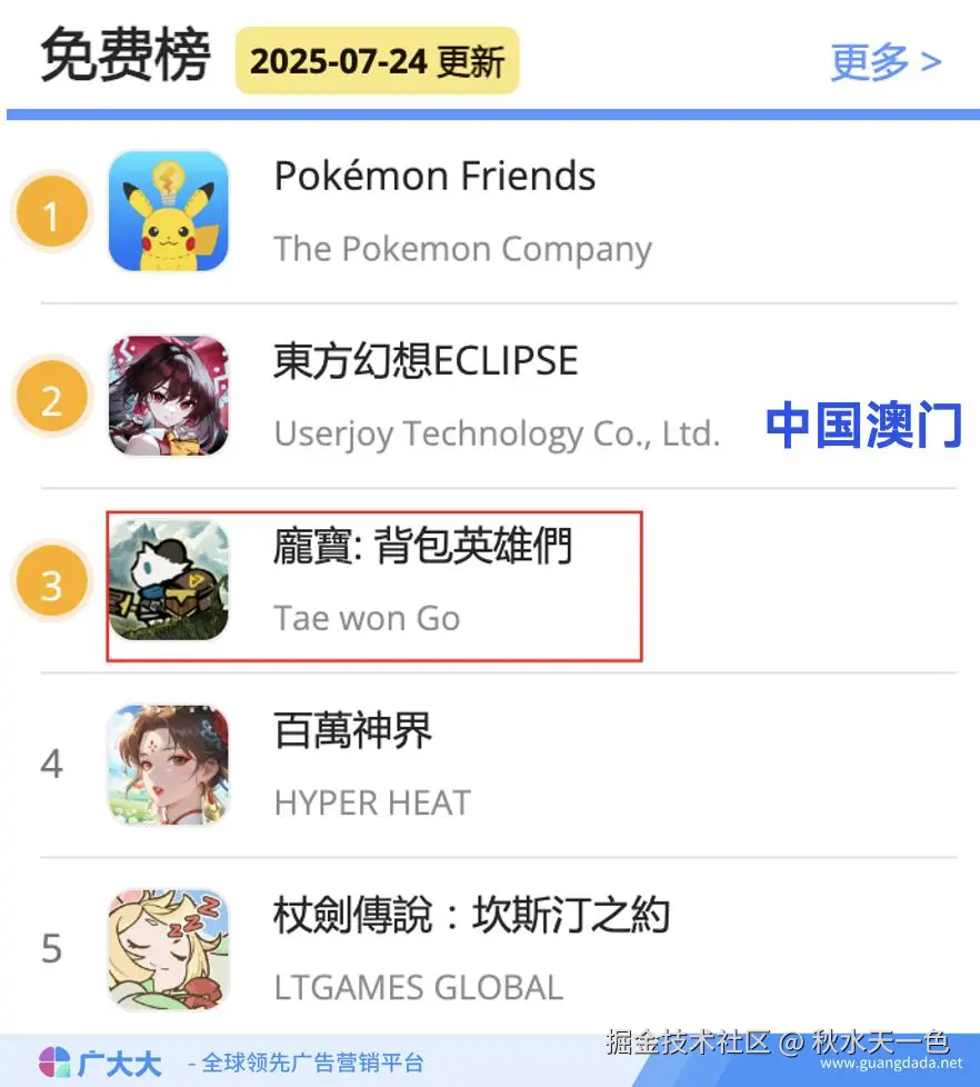 根据广大大抓取AppStore榜单,7月24日繁中版【龐寶: 背包英雄們】在免费榜“悄悄”探头挂在第3名。往上看,第2名是上线即登顶的宝可梦IP新作【Pokémon Friends】,往下看,第4名是免费榜、畅销榜双杀黑马、2025“最火”的出海手游【杖剑传说】。这么一对比,【龐寶: 背包英雄們】的TOP3排名的确有点东西。