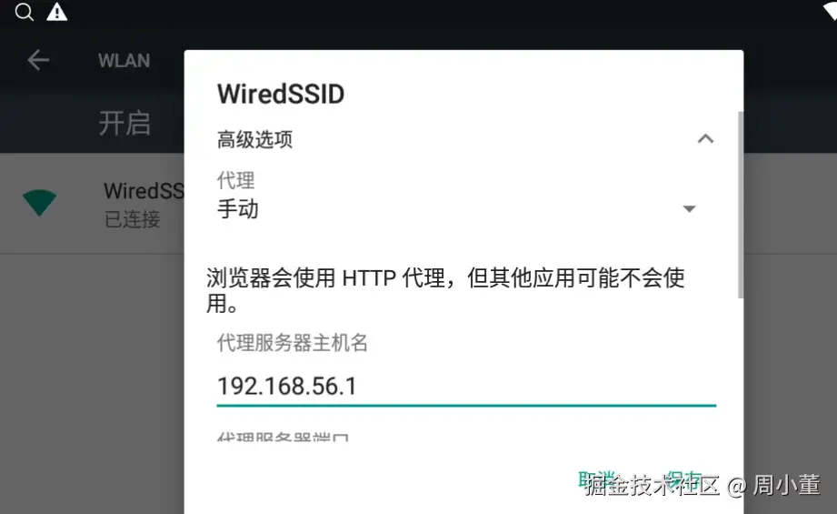 点击上图中的“修改网络”,会出现下图中的弹窗,勾选"显示高级选项",接着一切都明了了,代理选择“手动”,代理服务器主机名填写你电脑的ip就行了(windows系统可用ipconfig查看),接着再填写端口。