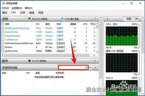 - 进入到CPU的页面后,在页面中部位置找到“关联的句柄”,然后在其后面的搜索栏中输入你刚才要进行重命名、删除或者是移动的文件名称,输入后点击搜索。