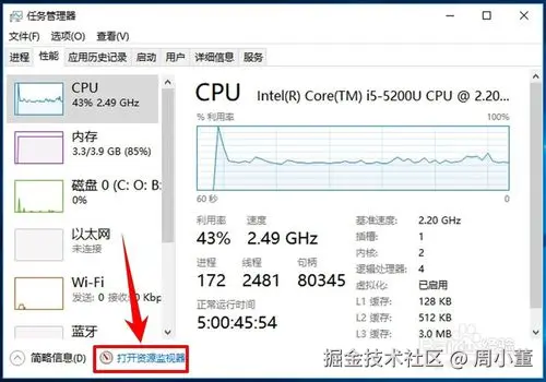 - 进入性能选项卡之后,在页面的左下角点击【打开资源监视器】。