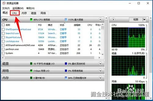 - 进入资源监视器页面后,在页面上方的菜单栏中点击CPU选项卡。