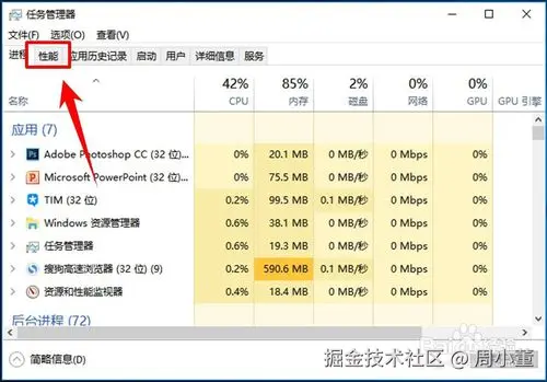 - 进入任务管理器后,在其上方点击【性能】选项卡。