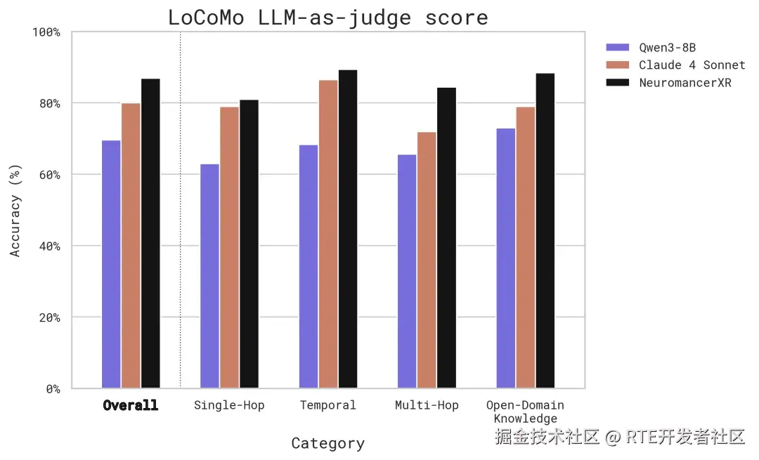 在技术层面,Neuromancer XR 的卓越性能源于一项关键的训练策略:通过在约 1 万条人工整理的结论推导轨迹上对 Qwen3-8B 模型进行微调,它能够生成自包含且便于检索的结论,从而有效地进行上下文综合。基于该模型,Honcho 在 LoCoMo 评估中取得了 86.9% 的最先进准确率。