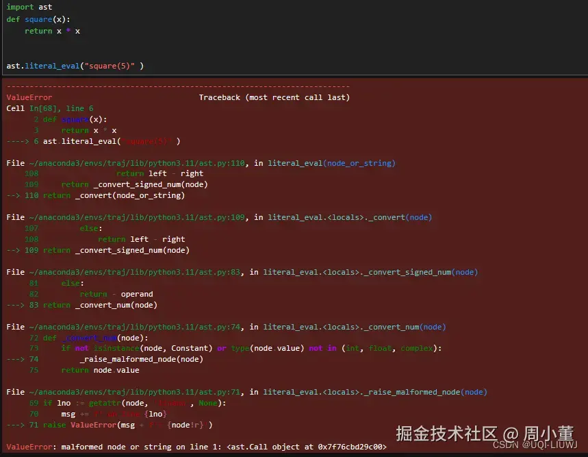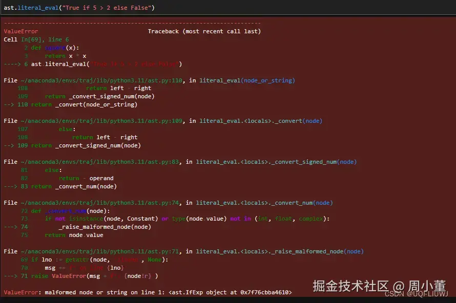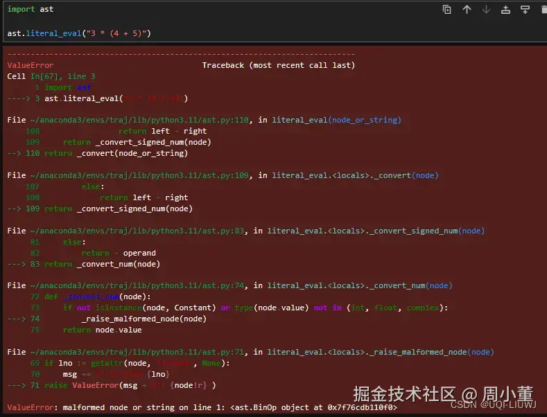 ast.literal_eval仅能解析 Python 字面量和一些容器类型(如列表、字典、元组、集合等),这意味着它不能计算包含 Python 表达式或函数调用的字符串。- 这是一个设计上的限制,以确保安全性,防止执行潜在危险的代码。