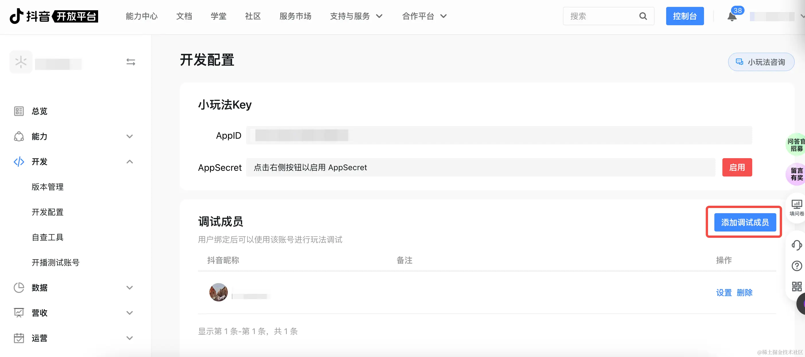 进入「开发-开发配置-调试成员」,每款玩法可设置100位调试成员