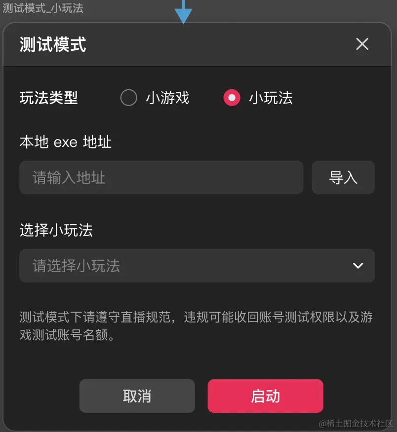 点击小扳手,在调试模式弹窗中,选择小玩法,输入玩法本地的exe地址,然后选择需要调试的小玩法,即可启动调试。