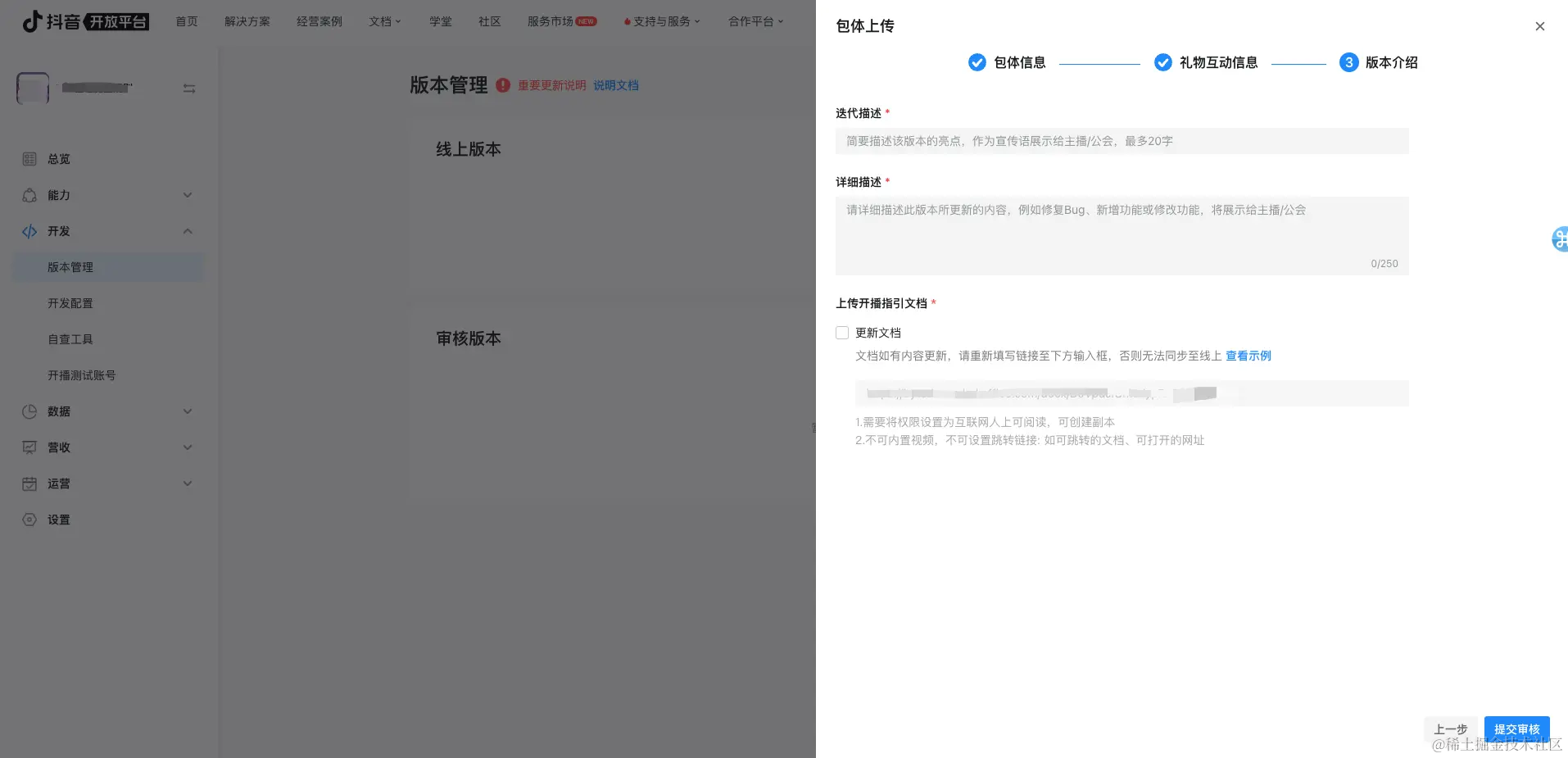 开播文档,平台将默认取用配置玩法基础信息时审核通过的开播文档,如需更新请勾选「更新文档」按钮