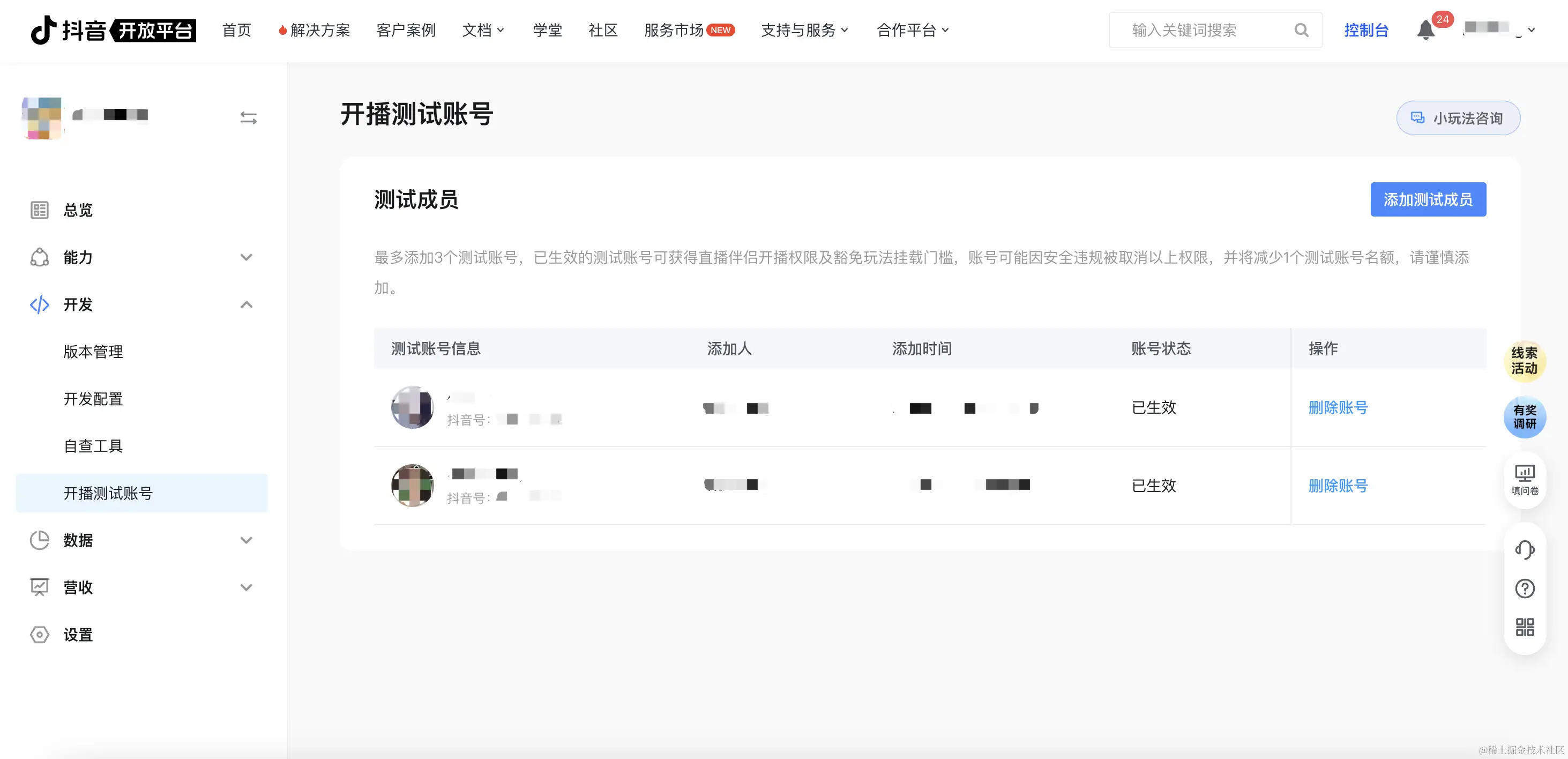 •每款玩法最多添加3个测试成员,添加后该账号可获得直播伴侣开播权限及豁免玩法挂载门槛