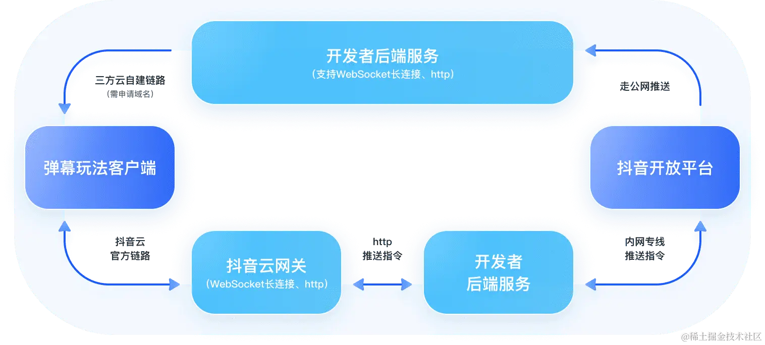 深度与弹幕玩法业务场景结合,支持免登录、免鉴权调用OpenAPI,支持免域名走内网专线推送指令到开发者服务,开发者服务推送给抖音云网关进行指令下发到主播玩法客户端。详情见弹幕玩法接入抖音云服务指南