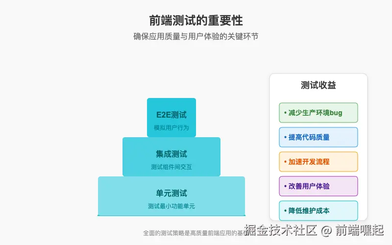 在当今快速迭代的Web开发环境中,前端代码变得越来越复杂,确保代码质量和用户体验变得至关重要。前端测试不仅能帮助我们发现潜在的bug,还能提高开发效率、降低维护成本,并增强团队对代码的信心。本文将带你了解从单元测试到端到端测试的完整测试体系,帮助你构建一套适合自己项目的现代前端测试策略。