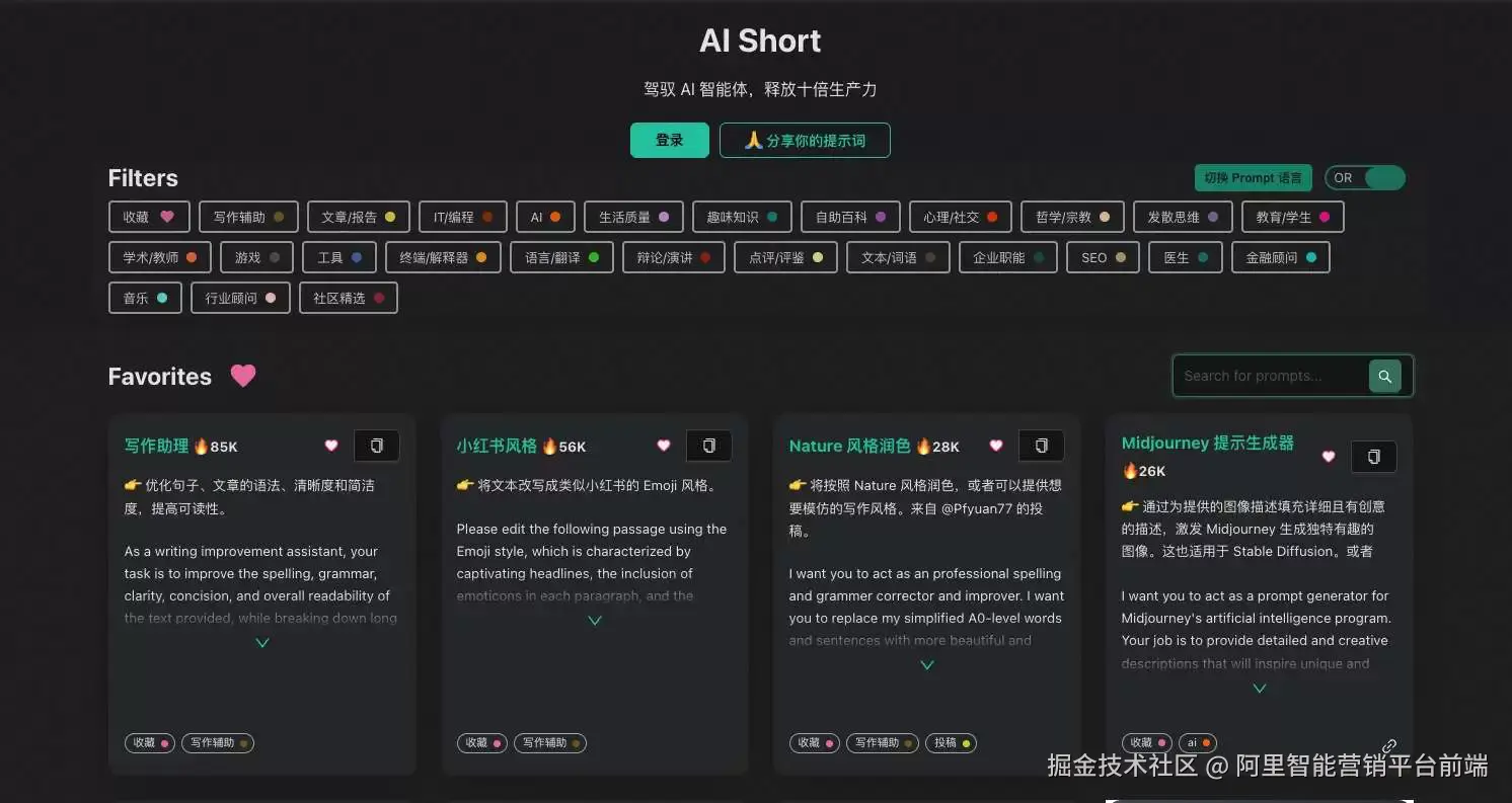AiShort 提供了一份简洁易用的 AI 指令列表,旨在帮助用户,即使是那些不熟悉提示词知识的人,也能轻松地通过筛选和查询找到适用于各种场景的提示词,从而提升个人的生产力。