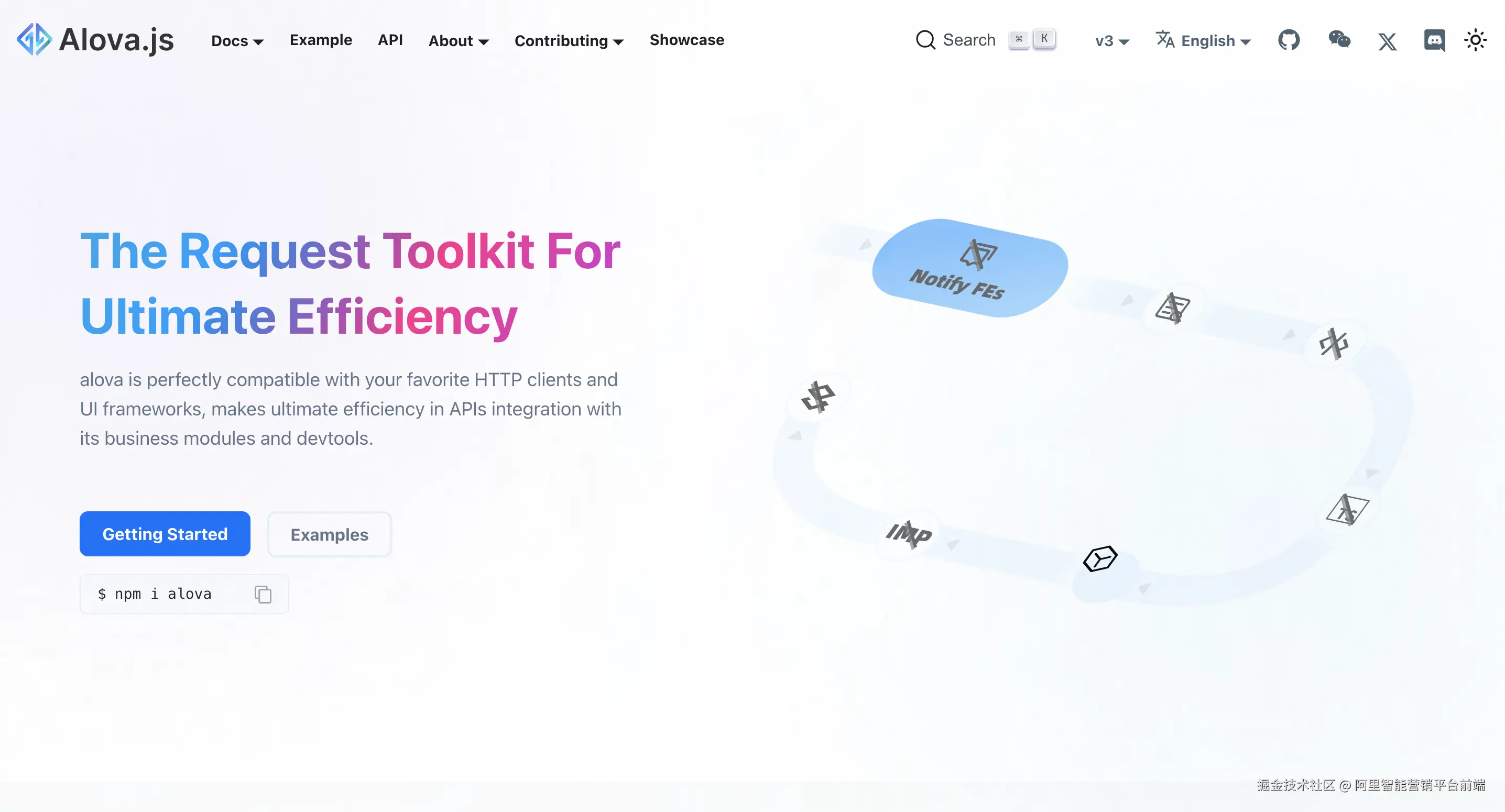 alova完美兼容你最喜欢的HTTP client和UI框架,快速开发客户端和服务的应用的业务逻辑,同时让API信息与代码进行交互,像虫洞一样拉近后端协作距离,极致高效地集成你的APIs