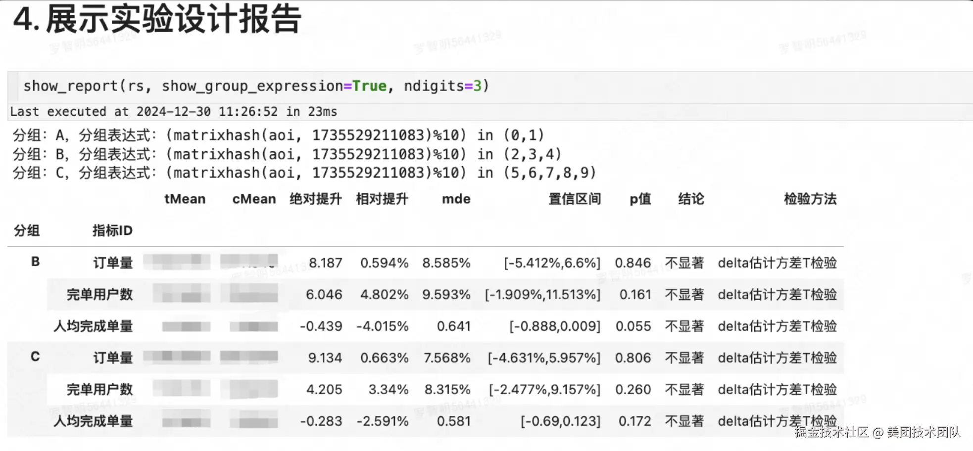 2. 业务可自行根据MDE、P值来判断该次分组是否达到实验开展的前提条件,如果达到满足实验条件,即可使用最终分组表达式来开展实验。