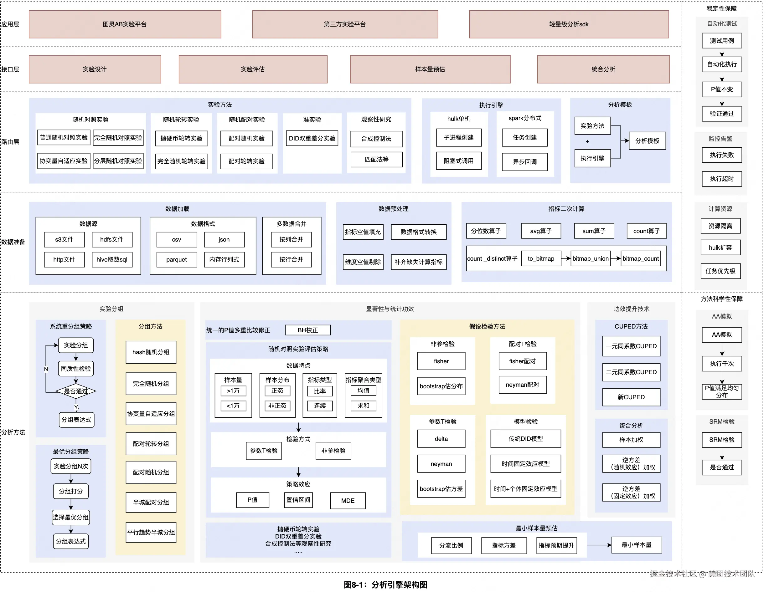 如图8-1所示,分析引擎提供标准化的分析流程以及多样化方法,采用模块化和分层设计原则来提升实验方法的迭代、拓展效率,以及实现像积木一样灵活应用,服务不同角色的用户。具体每层作用如下: