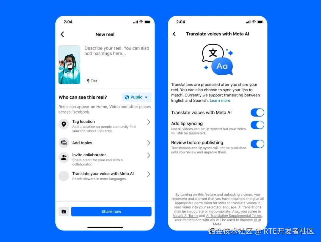 目前,功能已支持英语和西班牙语的双向翻译,未来将逐步扩展到更多语言。开放对象包括全球拥有 1000 名以上粉丝的 Facebook 创作者以及所有公开的 Instagram 账号。