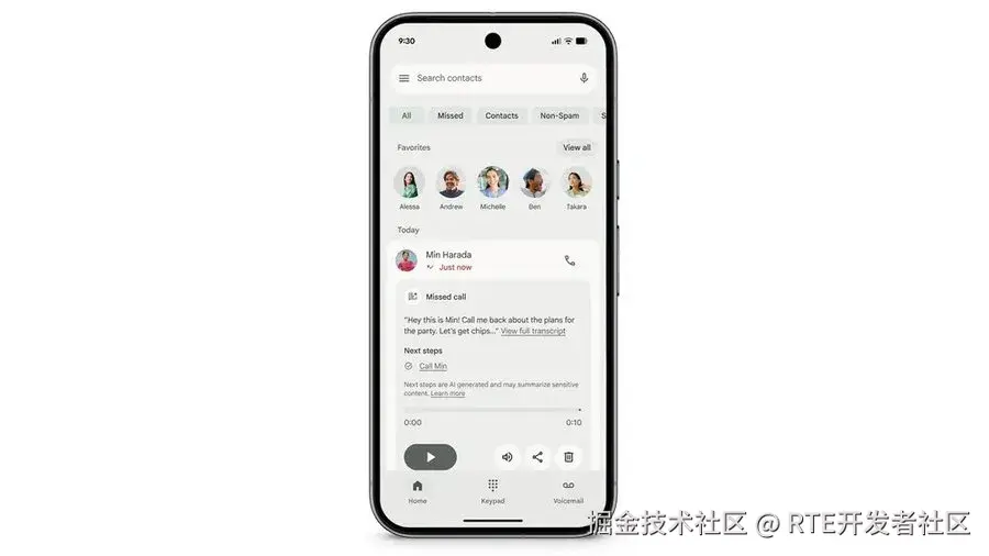 在通话方面,AI 的「留言」功能可以提供未接或拒接来电的实时文字转录,AI 还会根据收到的信息自动识别下一步行动。