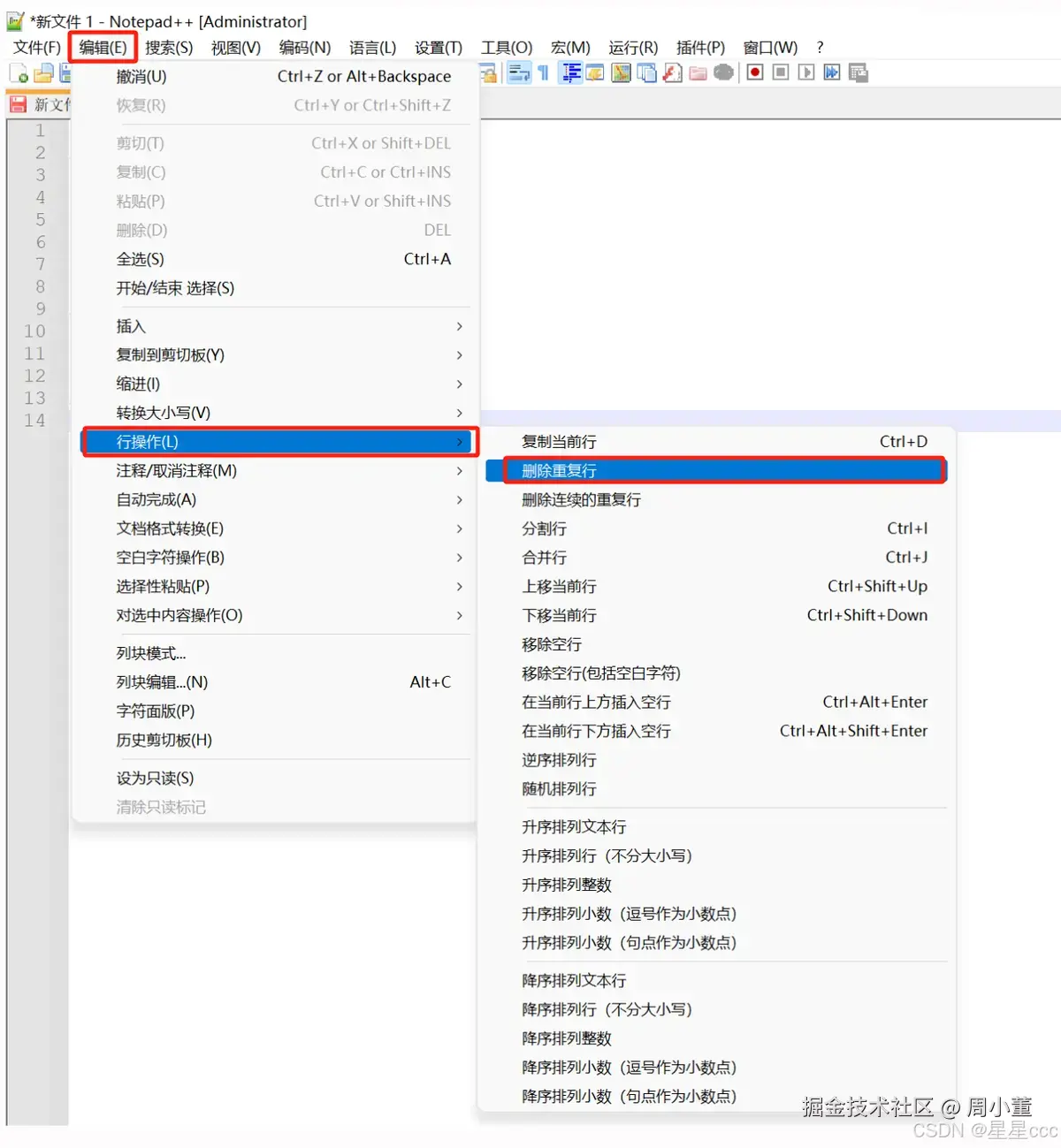 有时间我们只需要不重复项,可以使用notepad++的【删除重复行】操作。