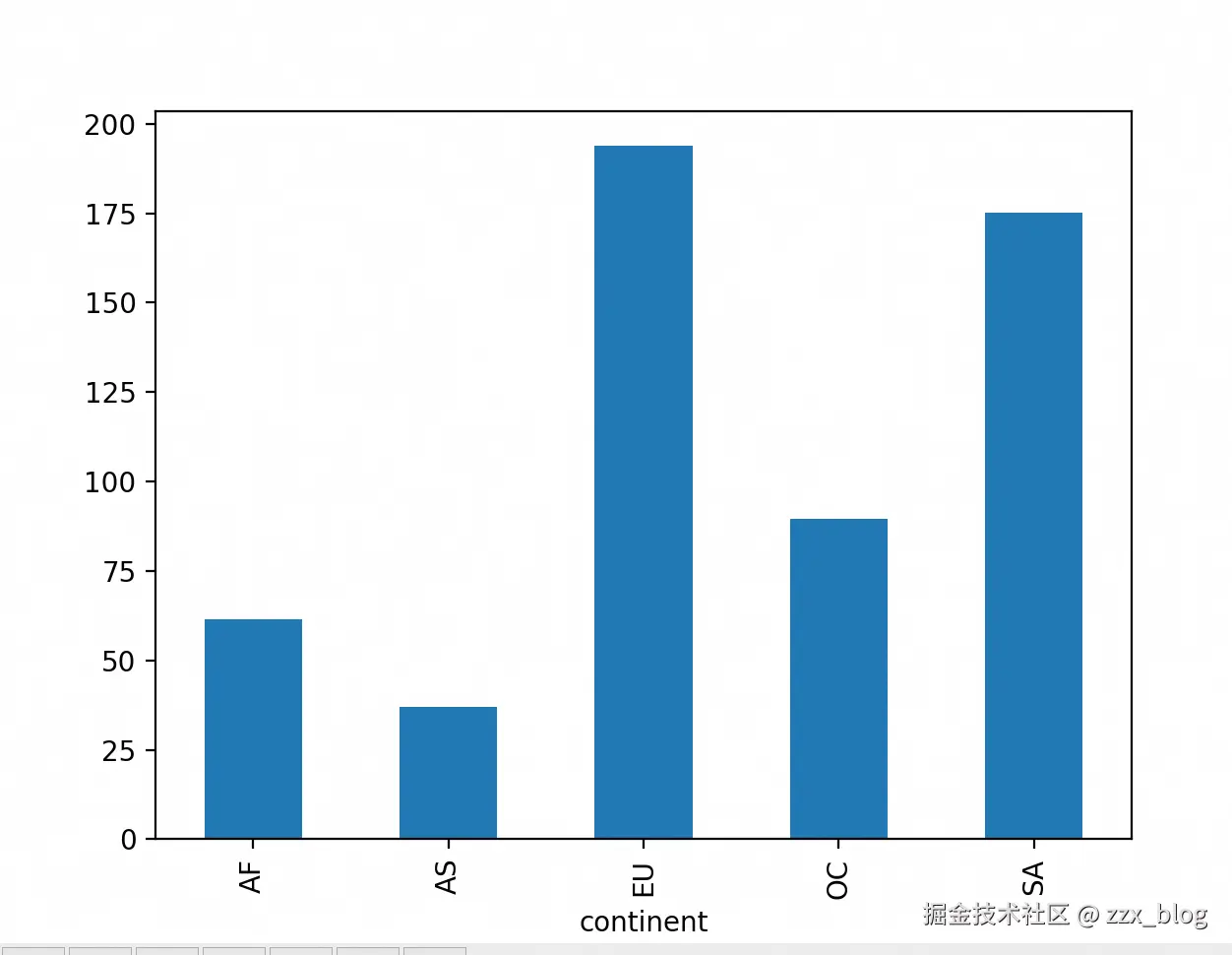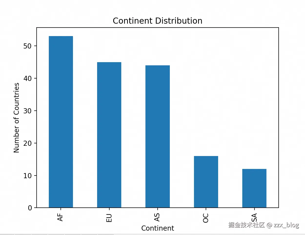 各大洲的国家/地区数量。每个柱子的下面有洲名的缩写,柱子的高度表示该大洲的国家/地区数量。我们可以很明显地看出非洲(AF)所含的国家/地区数量最多,南美洲(SA)所含国家/地区数量最少。