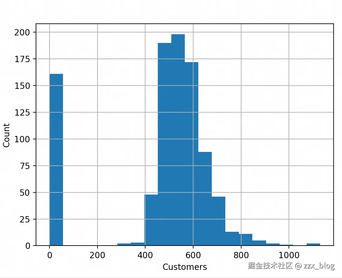 每个类别表示一个数值区间,比如客户数介于600~620的区间。y轴和条形图类似,是每个类别对应的观测对象数量。从图可以看出,大多数时候,每天的客户数介于500~700。